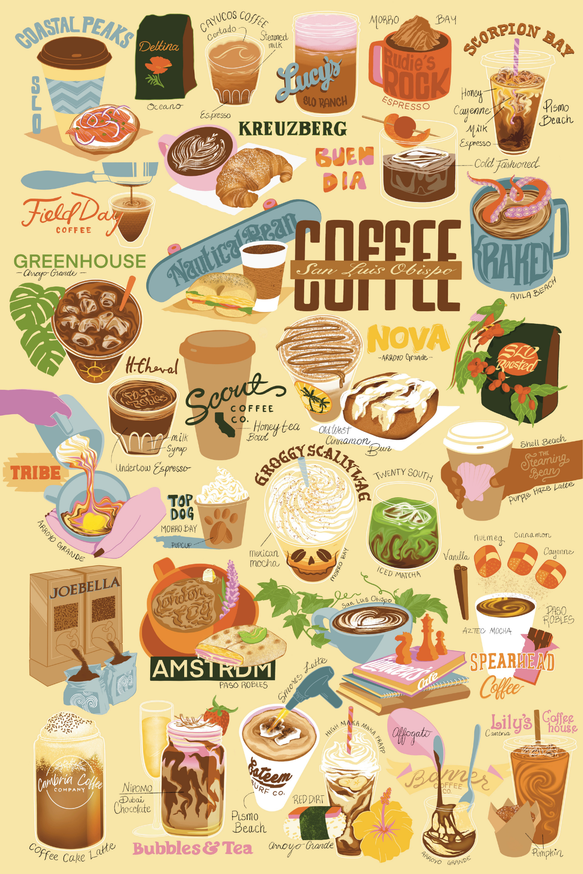 The many different names for our preferred types of coffee are limitless — and even then, each of us prefers that type of drink with our own specifications: decaf, almond milk, extra hot, iced. Across San Luis Obispo County, coffee drinkers are fortunate to have a wealth of options to sip a tasty morning brew. This is an ode to some of our favorite ways to caffeinate. Take a look at the beautiful illustration, then check out the list of locations below for more details.